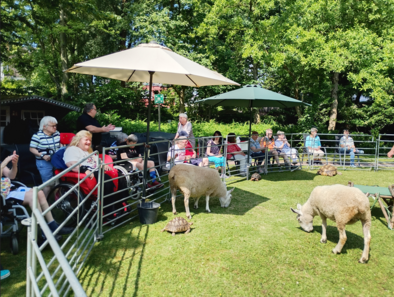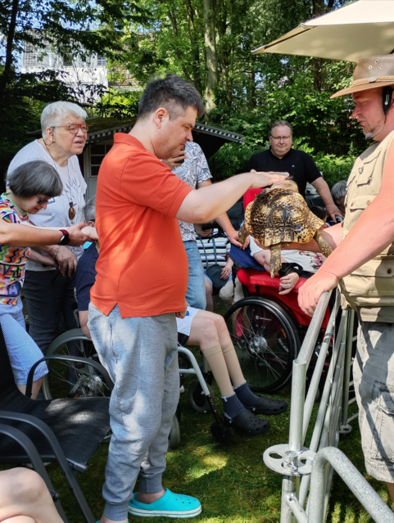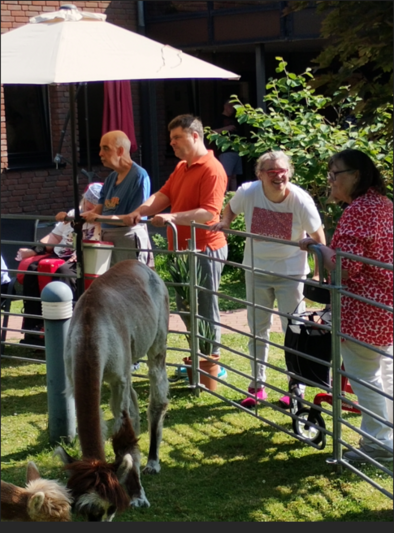 Diesen hatten Frau Claudia Müller und Judith Pössel gemeinsam mit ihrem Team für die Bewohnerschaft des Hauses organisiert. Laut Frau Müller kam der rollende Zoo bei den Bewohnern und Mitarbeitende sehr gut an. Das ganze fand bei strahlendem Sonnenschein statt. Die Tiere konnten von der Bewohnerschaft gestreichelt werden. Zum Mittag gab es Hot Dogs. Dann wurden spontan die Kinder der angrenzenden Kita eingeladen. Diese kamen in Kleingruppen und konnten sich gemeinsam mit der Bewohnerschaft des Hauses die Tiere von dem Zoodirektor erklären lassen. Zum Nachmittag wurde noch der Eiswagen bestellt. Alles in allem war es ein rundum gelungener Tag. Einige Bewohner/innen fragte auch, wann der rollende Zoo wieder kommt.